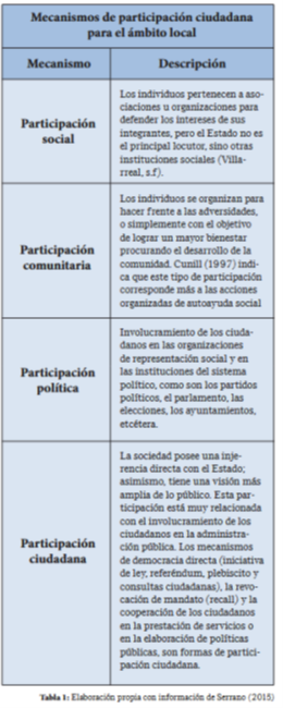 Y es que el apoyo a las instituciones se relaciona con elementos que garantizan representatividad ciudadana. En este sentido, la participación ciudadana no se limita únicamente al voto como se piensa en lo general, sino existen una diversidad de mecanismos para ser parte de los asuntos públicos. La Tabla 1 establece los distintos tipos de participación que deben considerarse desde el ámbito municipal.